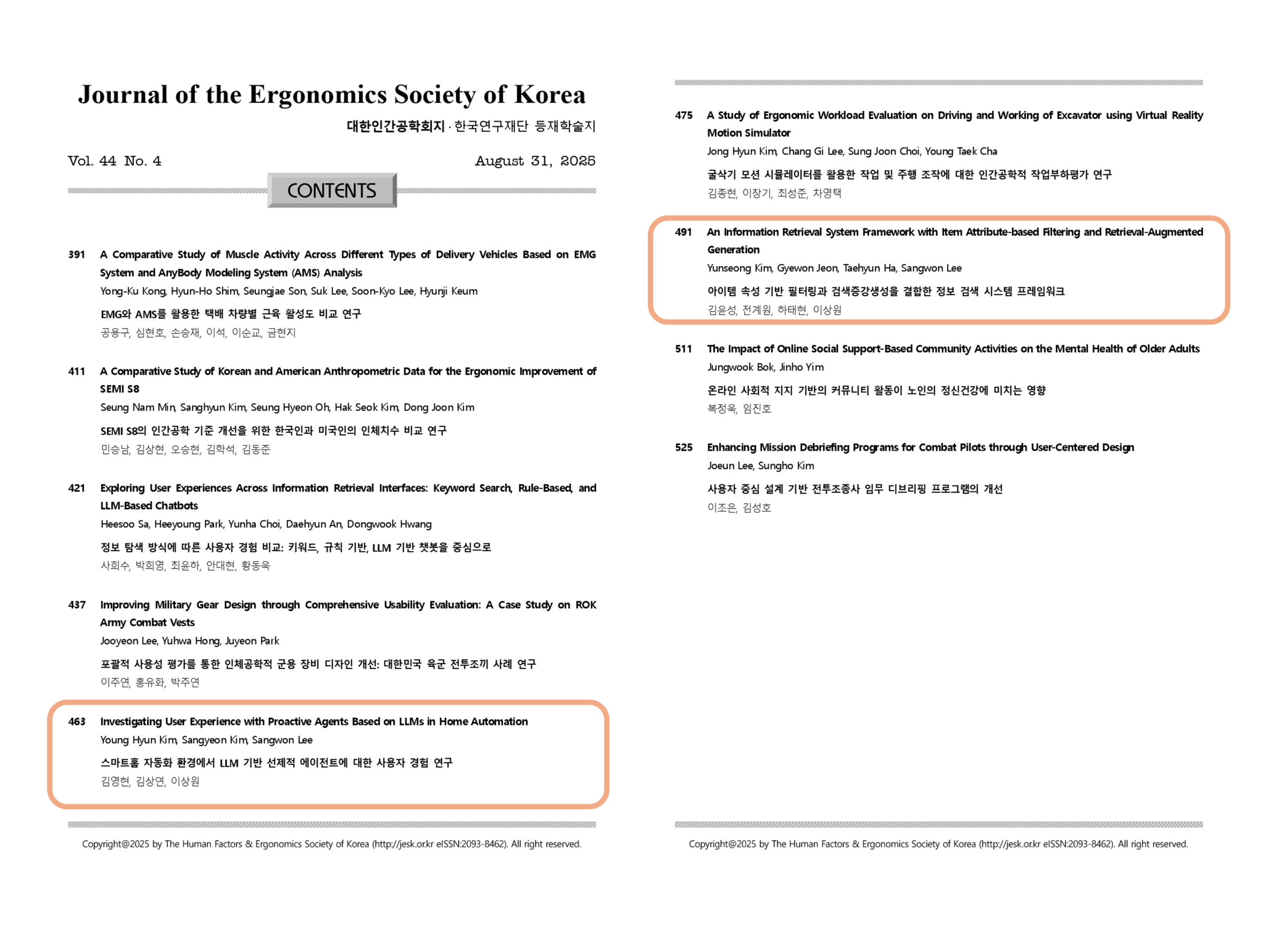 석사과정생 김영현 학생이 주저자인 “Investigating User Experience with Proactive Agents Based on LLMs in Home Automation” 논문과 석사과정생 김윤성 학생이 주저자인 “An Information Retrieval System Framework with Item Attribute-based Filtering and Retrieval-Augmented Generation” 논문이 인간공학회지 Vol.44 No.4에 게재 확정되었습니다.